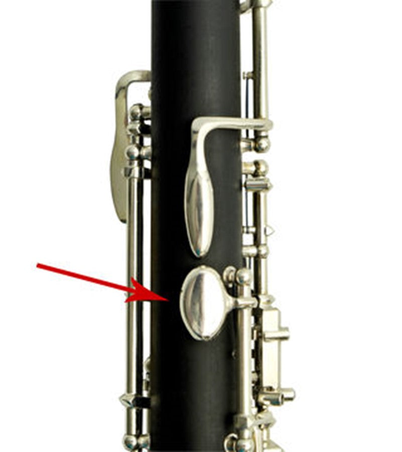 The thumbplate is a key that's held down quite a bit. However, when you play C in the first octave you take it off and those front two keys are released. This means the oboe is carefully balanced between the left index finger and the right hand thumb which hooks under the thumb rest on the second joint of the oboe.